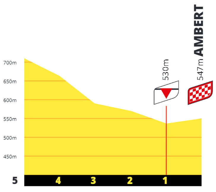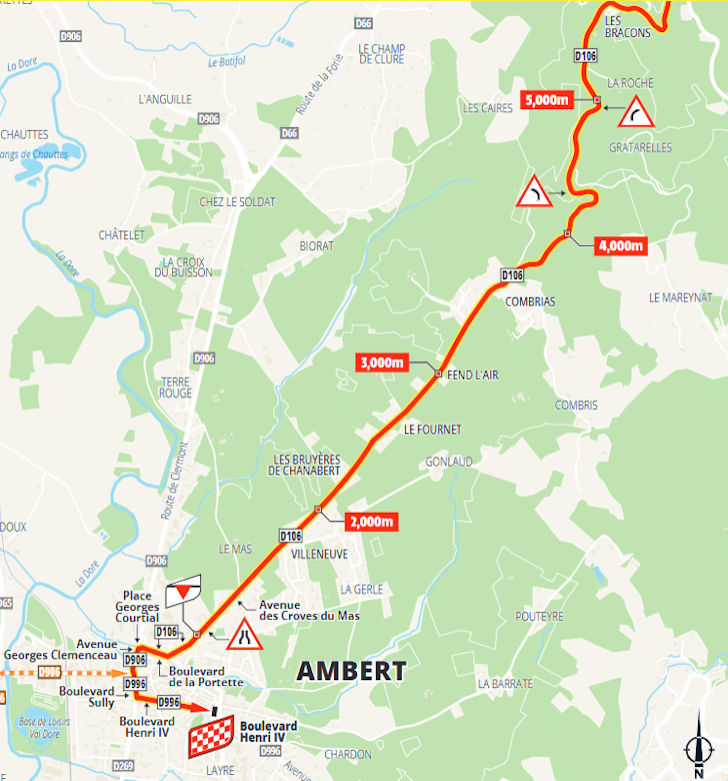 The Valcivières peaks out with 12 kilometres remaining. The road stays at altitude for 5 kilometres, and then the downhill sets in. From there, it’s a dive to the finish on Boulevard Henri IV in Ambert.