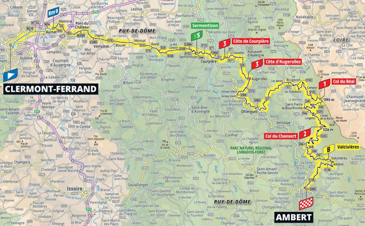 The total elevation gain for the day adds up to 2,500 metres. Most of the climbing comes in the three main climbs within the final 44 kilometres, while the Côte de Courpière (2.4-kilometre at 5.8%) and the Côte d’Augerolles (3-kilometre at 5.1%) will warm-up the climbing muscles in the first hour of action.