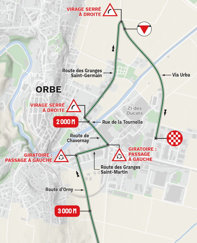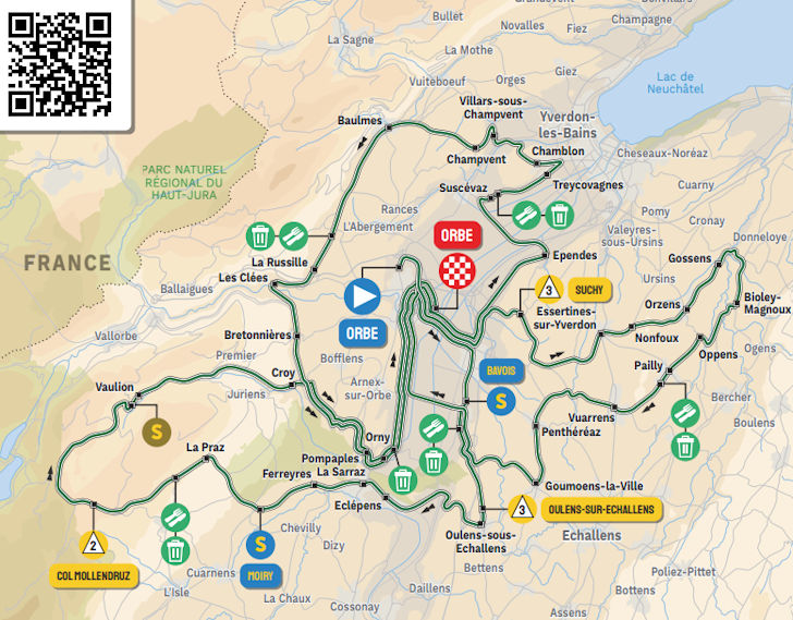 It’s a maze of loops that make up the 3rd stage. None of them are identical, but the routes are similar in character. Time and again the riders move from one climb straight to the next, with only the section around the finish passage in Orbe offering flat roads.