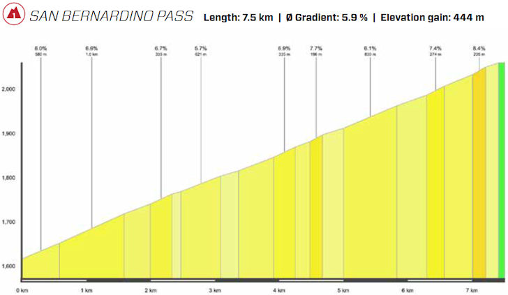 Upon reaching the foot of the San Bernardino Pass, the leaders have added a minute and a half to their advantage. Yet the bunch responds, and by the summit, the gap is trimmed back to 2 minutes, and by the time the leaders hit the penultimate climb, their advantage has dwindled to just a minute.