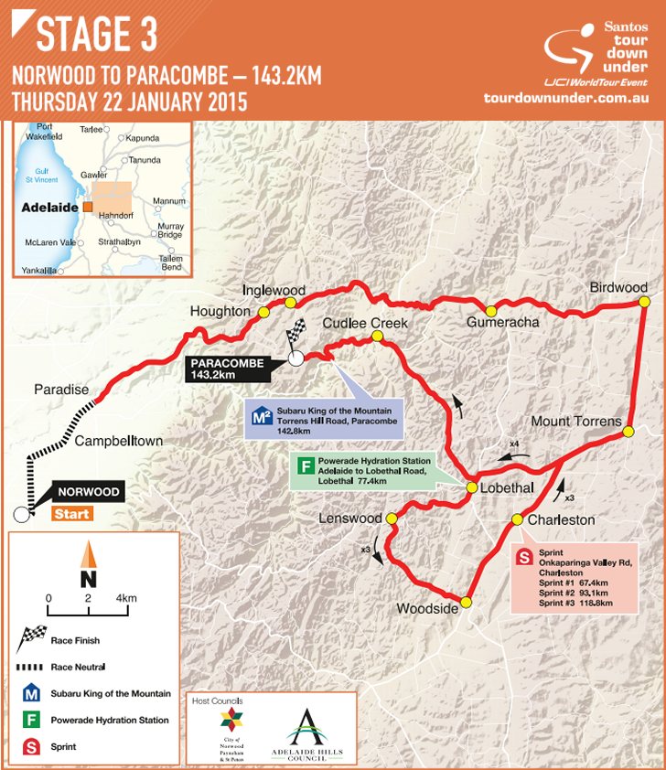 Related articles Favourites - Tour Down Under 2015 Overview - Tour Down Under 2015 Results stage 6 - Wippert takes final stage, Dennis GC - Tour Down Under 2015 Results stage 5 - Porte wins at Willunga Hill - Tour Down Under 2015 Results stage 4 - Sprint-victory Steele Von Hoff - Tour Down Under 2015 Results stage 2 - Lobato sprints to victory - Tour Down Under 2015 Bobridge best of four - Tour Down Under 2015 Route stage 1 - Tanunda – Campbelltown - Tour Down Under 2015 Route stage 2 - Unley – Stirling - Tour Down Under 2015 Route stage 4 - Glenelg – Mount Barker - Tour Down Under 2015 Route stage 5 - McLaren Vale – Willunga Hill - Tour Down Under 2015 Route stage 6 - Criterium Adelaide - Tour Down Under 2015 More articles Giro 2026: Route