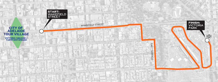 The start podium stands on Wakefield Street and the finish is at Victoria Park. In the first kilometre the riders race down the dead-straight Wakefield Street before heading onto East Terrace and Pit Straight. They then enter the closing criterium in Victoria Park, all the time without meeting any elevation gain. The second half of the route features some corners, but speeds are still expected to be sky-high.