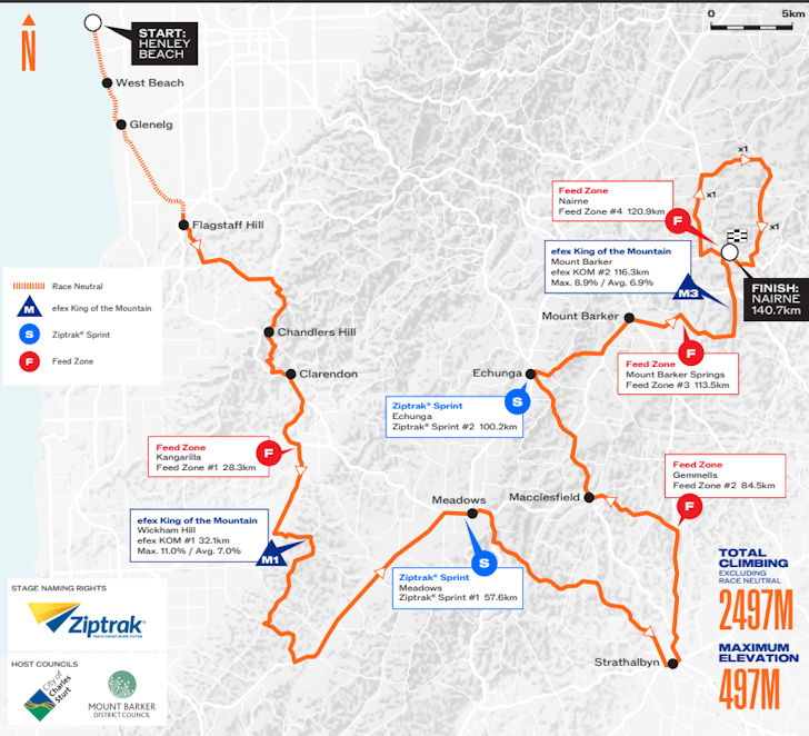 The stage concludes on a rolling 19-kilometre loop leading to a final showdown on Old Princess Highway in Nairne. A 1-kilometre stretch at roughly 4% inside the final 4 kilometres is likely to add an extra layer of suspense.