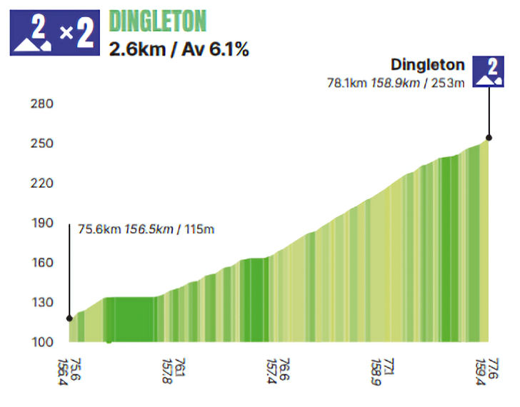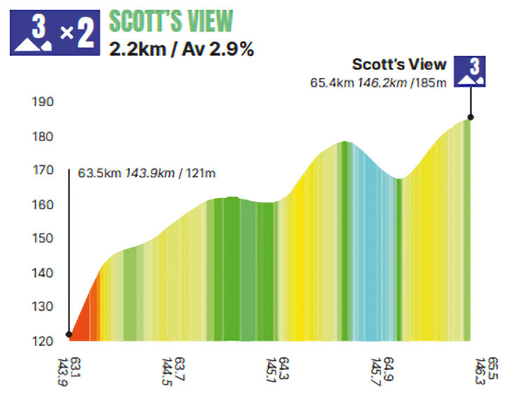 The final climb, Dingleton (2.6 kilometres at 6.1%), comes 23 kilometres from the finish in Kelso.