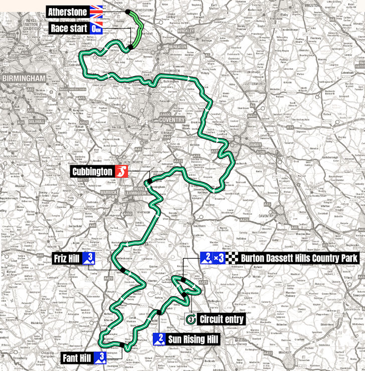 Stage 4 should suit the punchers. After a largely flat approach, the finale takes place on a circuit in Burton Dassett Hills Country Park. The riders tackle a 700-metre climb at 9% three times, with the finish line waiting at the summit on the final ascent.