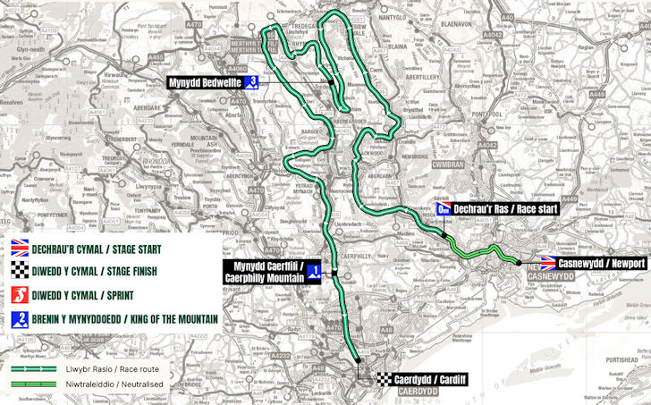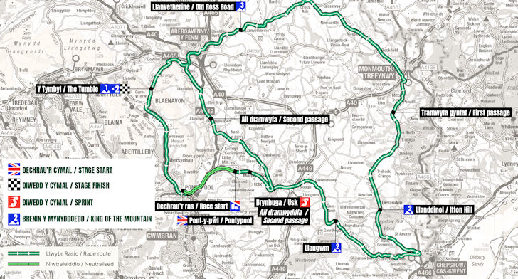 The 5th stage loops through Wales in two circuits, featuring longer climbs this time around. The standout is The Tumble, a 5-kilometre ascent at 8% that also doubles as the summit finish.
