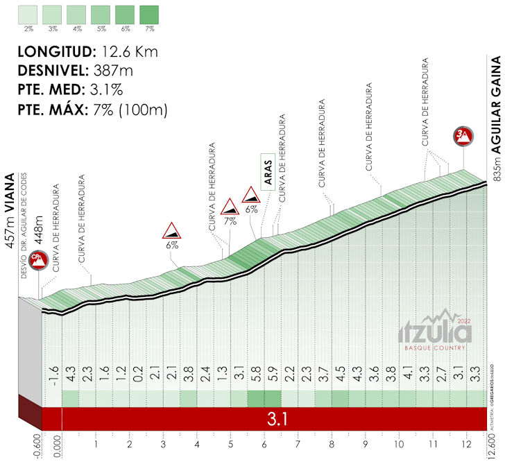 The first passage in Viana happens 33.3 kilometres before the finish. The riders almost cross the line and moments later they enter the Aguilar Gana, a climb of 12.6 kilometres with an average gradient of 3.1%. The false flat downhill is even longer than that.