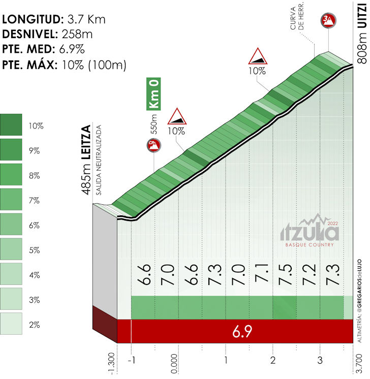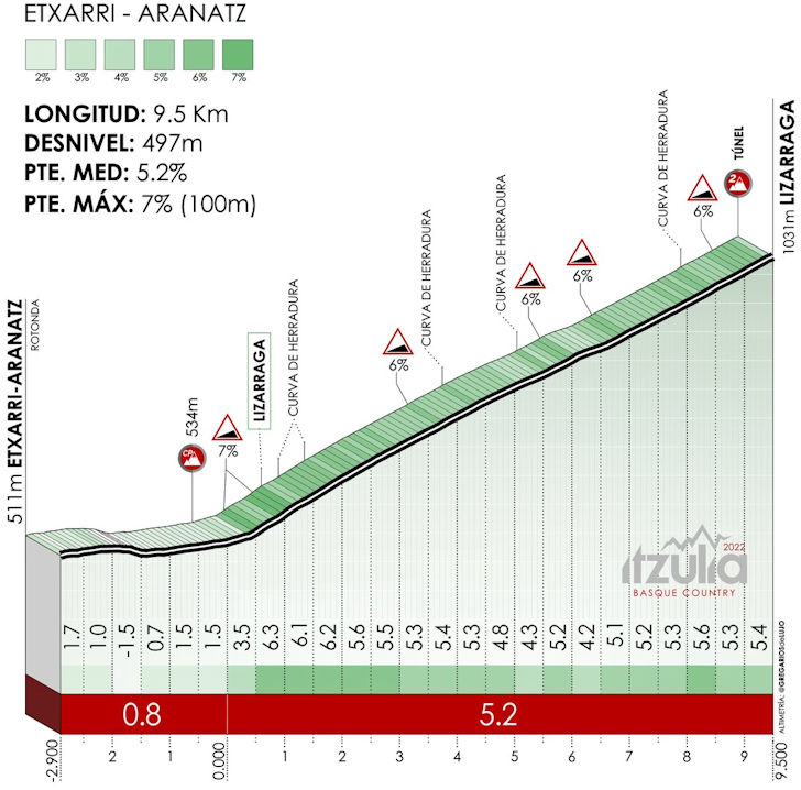 The race kicks into gear to head south. The first 60 kilometres features three ascents. The first one leads to Uitzi, is 3.7 kilometres long, and averages 6.9%. Following a short descent the route continues to climb at moderate gradients. The third ascent goes to Lizarraga, is 9.5 kilometres long and averages 5.2%. At a little over 1,000 metres, the top of this climb marks the highest point of the day.