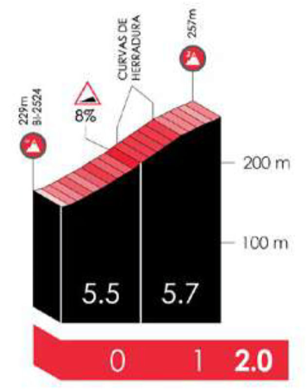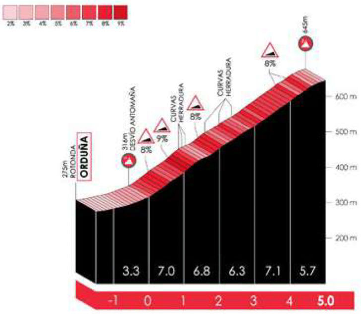 The Bikotx-Gane then adds 8-kilometre at 4.9% to the mix before a 5.2-kilometre descent leads onto the Sarasola: 2 kilometres at 5.6%. The road then drifts gently downhill for 20 kilometres towards a short, uncategorised climb of 1.5 kilometres at 6.8%, which the riders already reconnoitred in the neutralised section earlier in the day, albeit as a descent. At the summit, as they pass through the village of Zaratamo, just under 7 kilometres remain.
