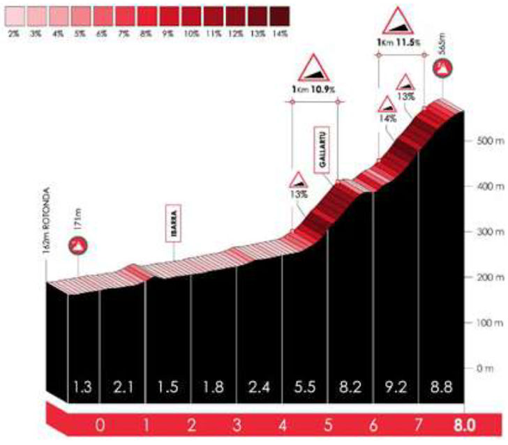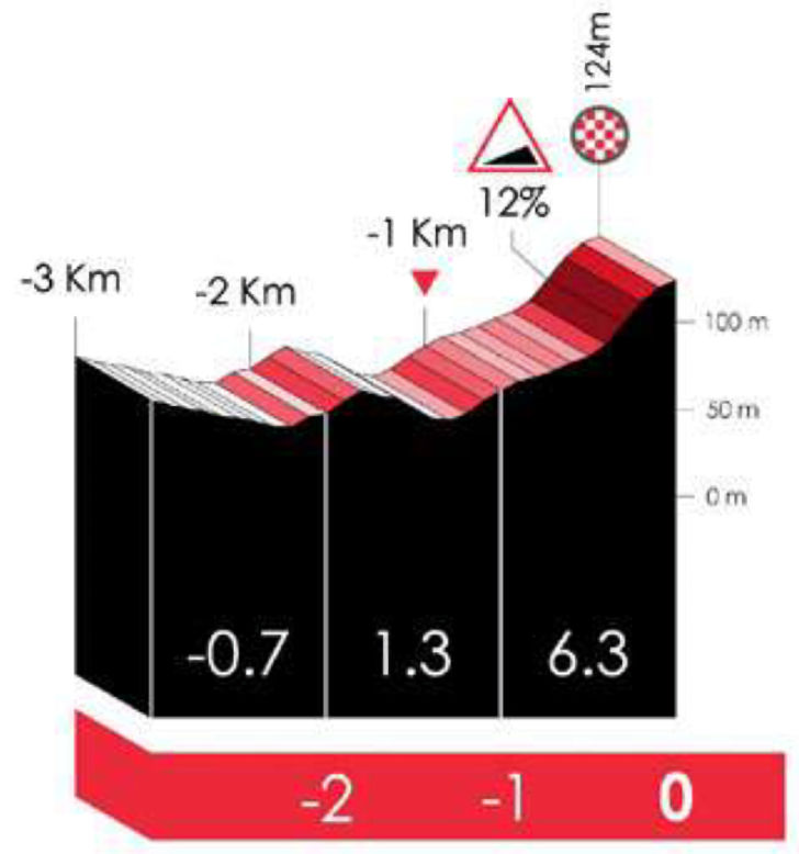 Following the descent and a gently undulating section, the final kilometre climbs at 6.3% to the finish. The gradient ramps up steadily, with the last 400 metres rising at 8.8%.
