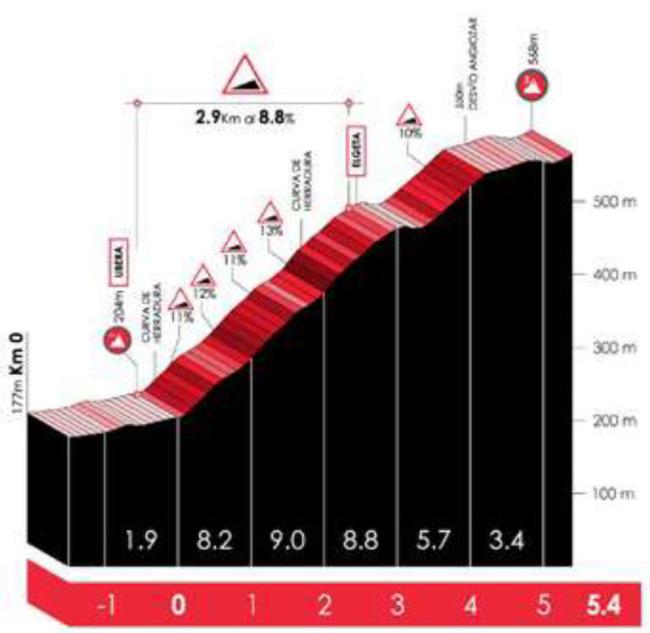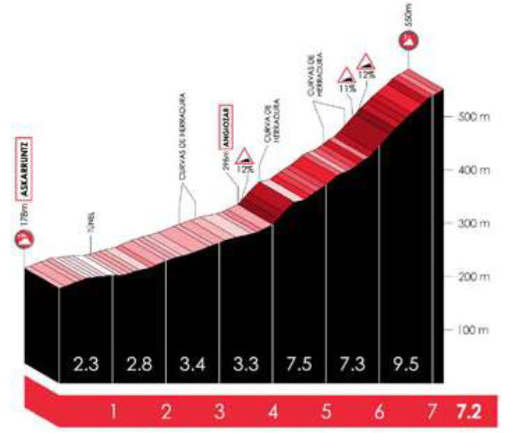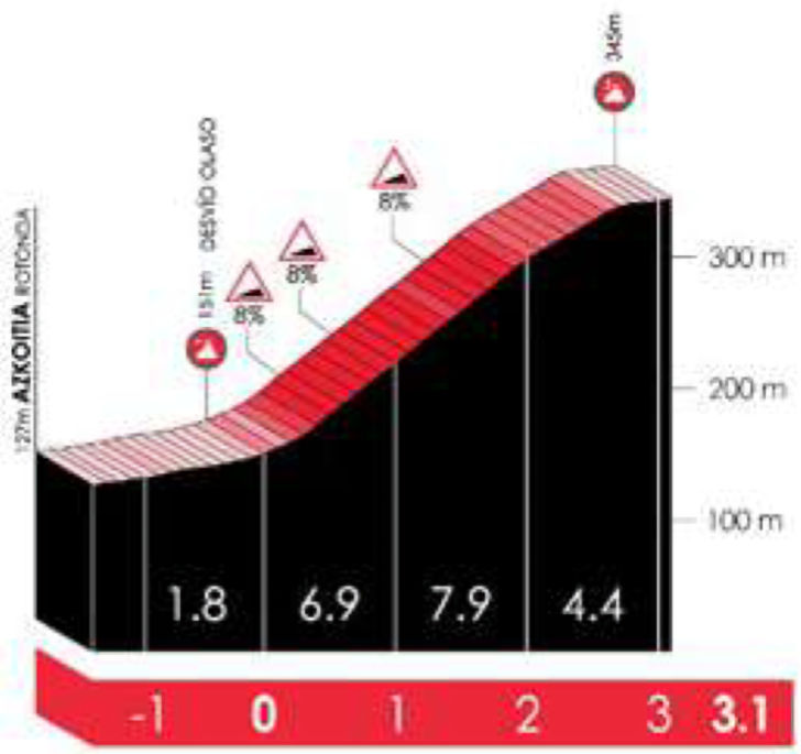 After the descent, the road rises on a false flat back to the finish, after which the exact same loop is tackled again, featuring the Elosua and Azkarate.
