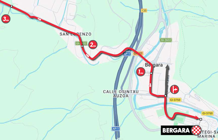 The riders begin with a southern loop that opens with the Asentzio, a climb of 5.4 kilometres at 6.7%. After passing the finish line for the first time at kilometre 27, a northern loop follows, which opens with the Elosua climb: 7.2 kilometres at 7.5%. Hardly back in the valley, the next obstacle comes in the form of the Azkarate, 3.1 kilometres long with an average gradient of 6.3%.
