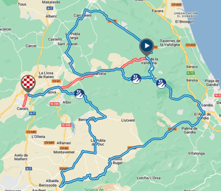 The riders clip into their pedals in Canals, a place in inland Valencia province somewhere halfway between Calpe and Valencia city. Shortly the first obstacle takes the shape of the Alto de Genoves, which is a modest climb of 2.9 kilometres at 5.2%. On rolling roads the route continues until a long descent leads to Real de Gandía, close to the coast.