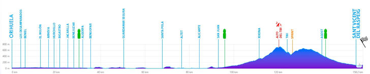 Friday 6 February – Stage 3 of the Volta a la Comunitat Valenciana sees the peloton travel 158 kilometres from Orihuela to Sant Vicent del Raspeig. They tackle around 1,500 metres of elevation gain before the race concludes with a long downhill run to the line.