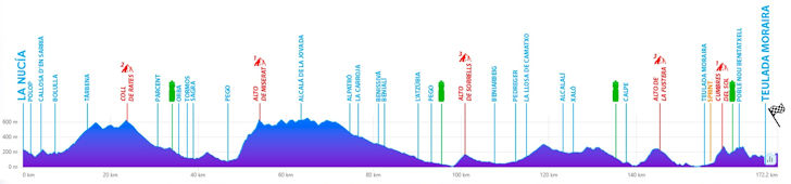 The climbing starts early in the race, as the riders head towards Tàrbena, tackling 6.7 kilometres at an average gradient of 5.4%. There is no immediate descent, on the contrary, shortly afterwards the Coll de Rates follows: 1.5 kilometres at 6.2%. Only then does the route head downhill.