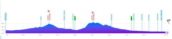 The final stage features two climbs. The Alto de L’Oronet rises for 4.2 kilometres at an average gradient of 4.4%, while the Port del Garbí climbs for 5.4 kilometres at 8.9%. The latter is also known as La Frontera and is a brutal ascent, with ramps reaching up to 18%. Its summit is located around 45 kilometres from the finish.