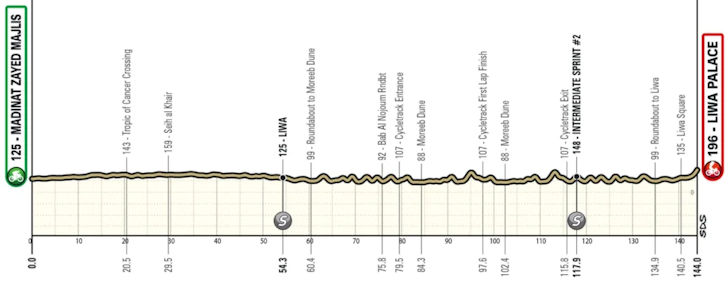 In the final 30 kilometres, the riders leave the dune circuit and head back towards the Liwa Oasis. The route follows rolling roads in this section, after which the final 1.5 kilometres rises at 4.2%, with the last 500 metres averaging 6%.
