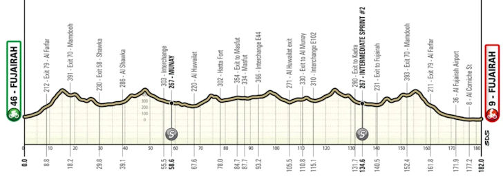 Thursday 19 February – Stage 4 of the UAE Tour is a constantly rolling affair, with the riders tackling around 2,400 metres of elevation over a distance of 182 kilometres. The last 26 kilometres drop down towards a flat finish.