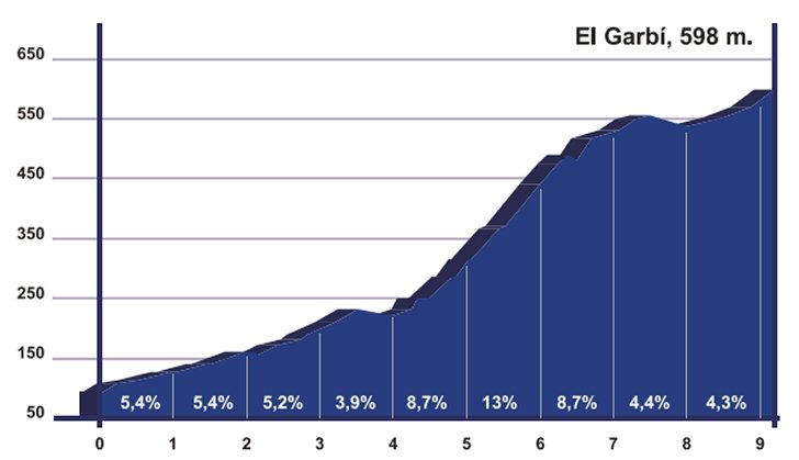 Time for a breather. For some 30 kilometres nothing much happens. Finding resources for the last climb of the day. Just as the Eslida, El Garbí is a 1st category ascent - although El Garbí is much longer. The climb amounts to 9.3 kilometres while the average gradient is 5.2%. The Garbí also featured in last year's Vuelta a España's 6th stage - and also as the last ascent.