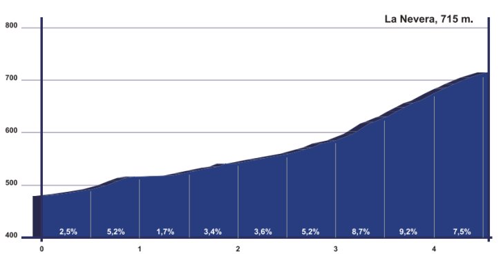 Once the flag is dropped the road starts to climb gradually. Pico del Aguila is crested with 30 kilometres done and another 30 kilometres down the road the riders are at the summit of La Nevera. Both climbs are doable, yet you have to race all the way the way to the top and peaking at over 700 metres, it can be cold up there.