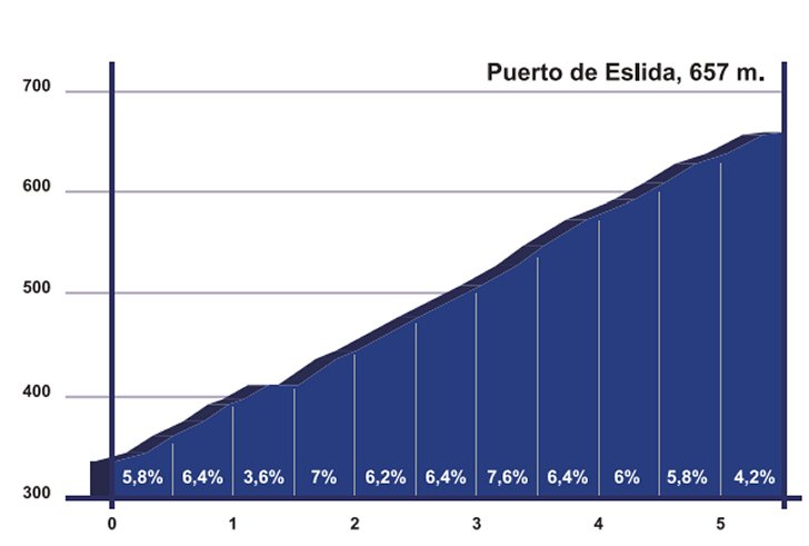 Now, the riders hit the route of last Vuelta's 6th stage. Another non-steep climb up the Alto de Alcudia de Veo is followed by a short descent before the Puerto de Eslida appears. The first three climb were 3rd category, this one is 1st category. The Eslida is 5.2 kilometer while it is averaging 5.6%. At the top the riders are halfway down the route.
