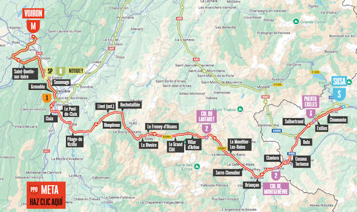 Louis Vervaeke, Sean Quinn, Joel Nicolau, Kamiel Bonneu and Mario Apricio initiate the break in the last part of the Puerto Exilles. Nicolau is the first to crest the climb, while Vervaeke takes the most KOM points on the Col de Montgenèvre. The breakaway’s lead is then around 4 minutes.