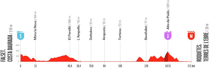 The route opens on descent before continuing on rolling terrain and dozens of kilometres of flat roads. Then, with roughly 50 kilometres to go, the road rises for 2.9 kilometres at 5.7%. Shortly afterwards, a similar bump appears, and then another, before the Alto de Pauls offers the only chance for those keen on wearing polka-dots to pick up some mountain points.