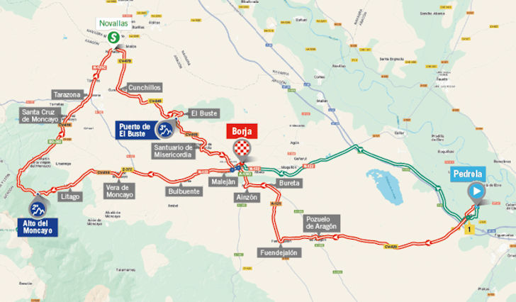 On the Alto del Moncayo, Erica Magnaldi rides alone at the front for a while , but by the time she reaches the summit, she’s been reeled back in. Justine Ghekiere takes the maximum mountain points at the top.