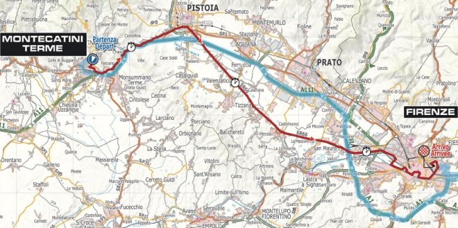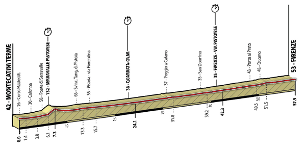 Measuring-point two is set up in Quarrata-Olmi, after 24.1 kilometers, and the third and last is found in Via Firenze-Pistoviese, after 42.3 kilometers. A few kilometers after this, riders head for the city. In Firenze, again there will be some curves and it is especially important to stay upright. And, of course, to keep the momentum going …